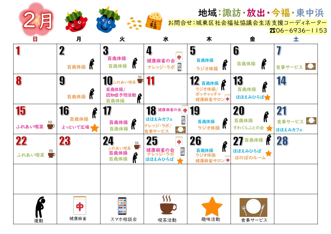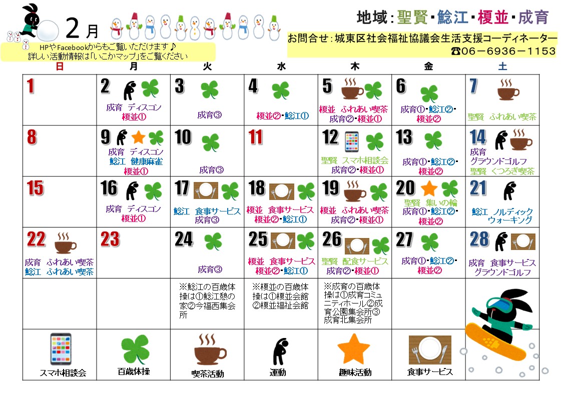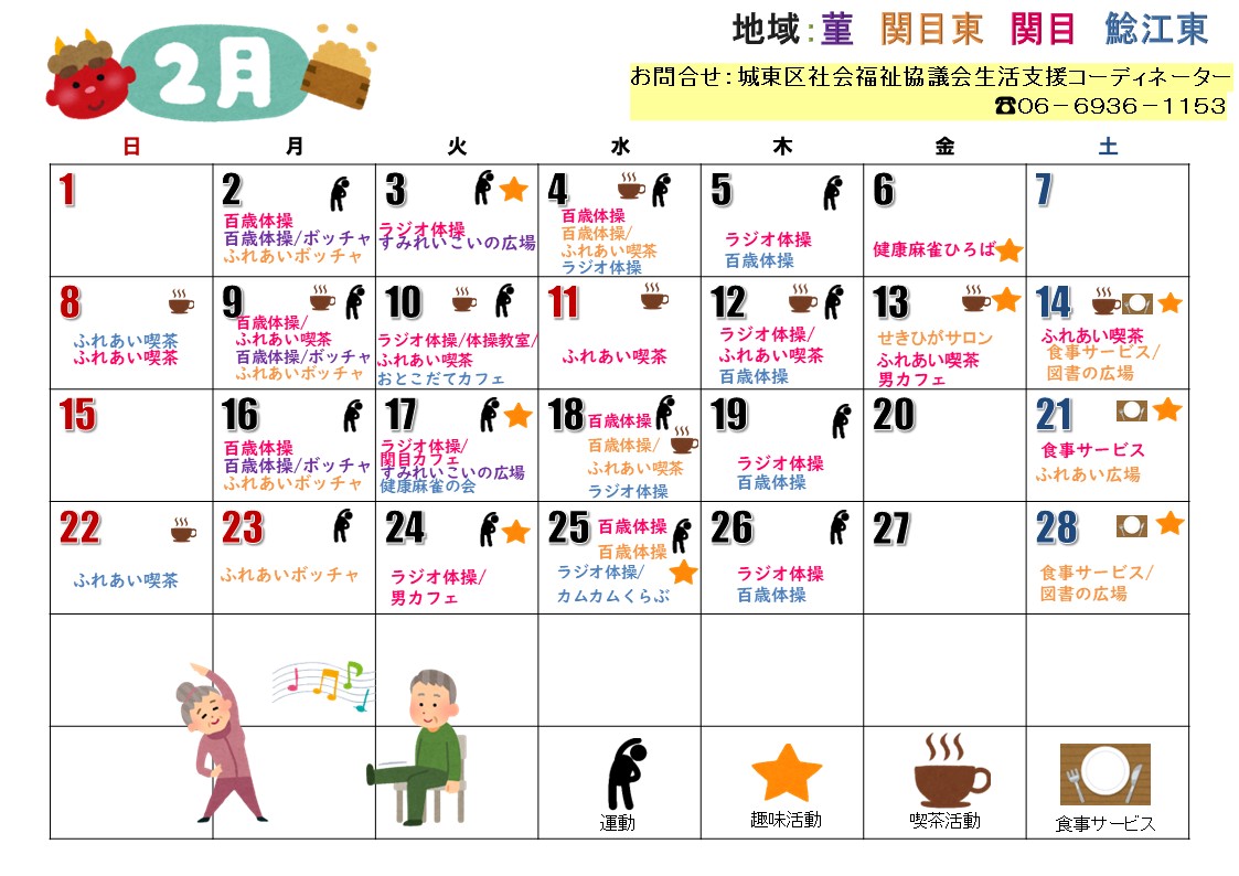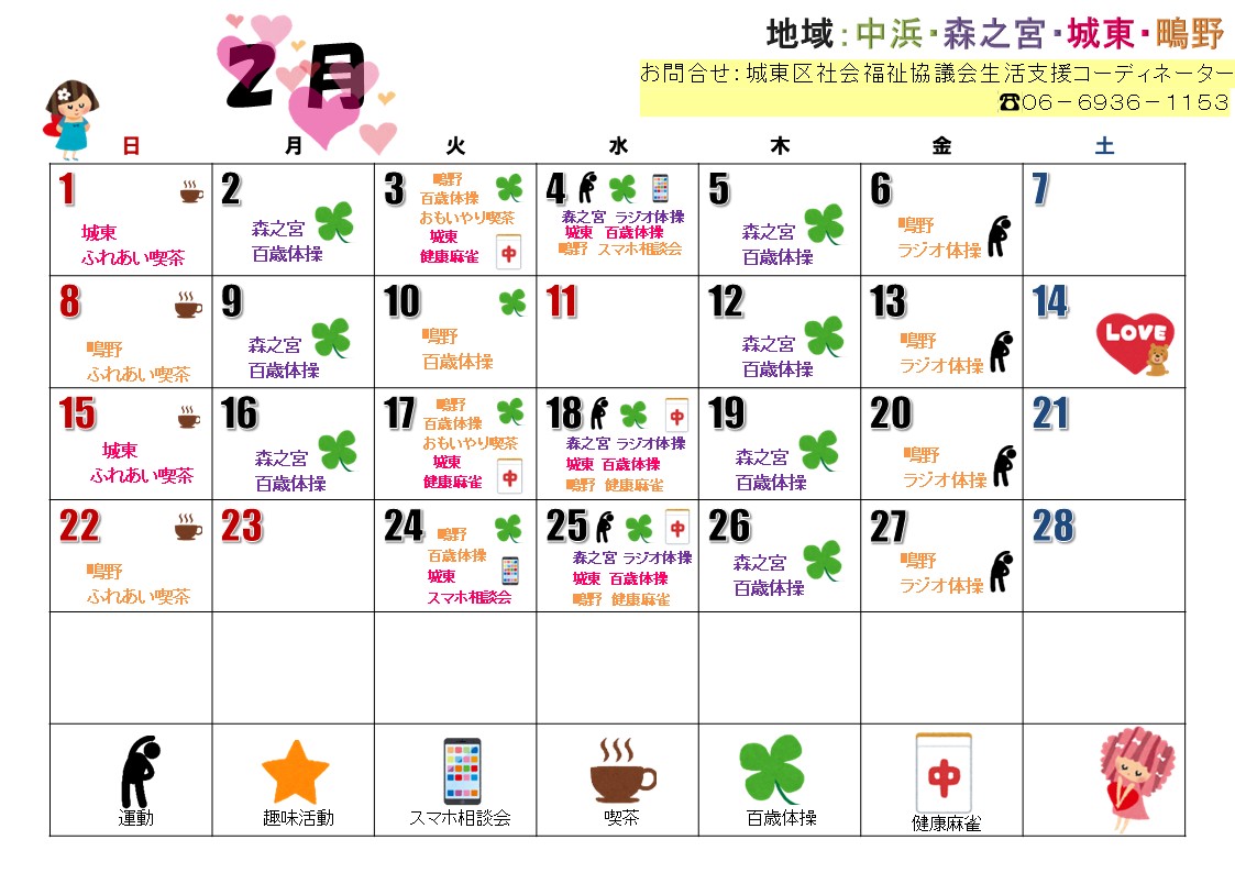 城東区内16地域で開催されている体操や喫茶活動などをカレンダーにしております。