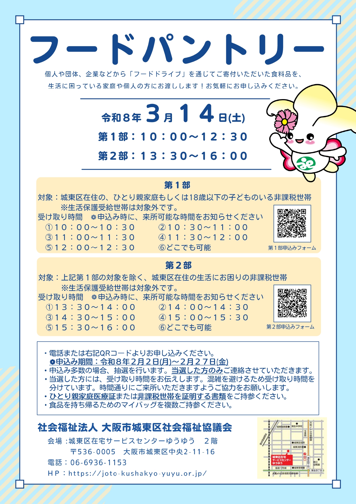 【第1部】城東区在住のひとり親世帯もしくは子どものいる非課税世帯(18歳以下) ①10:00~10:30 ②10:30~11:00 ③11:00~11:30 ④11:30~12:00 ⑤12:00~12:30 ⑥どこでも可能 【第2部】上記の第1部の対象を除く、城東区在住の生活にお困りの非課税世帯 ①13:30~14:00 ②14:00~14:30 ③14:30~15:00 ④15:00~15:30 ⑤15:30~16:00 ⑥どこでも可能 ※来所可能な時間をお伝えください |